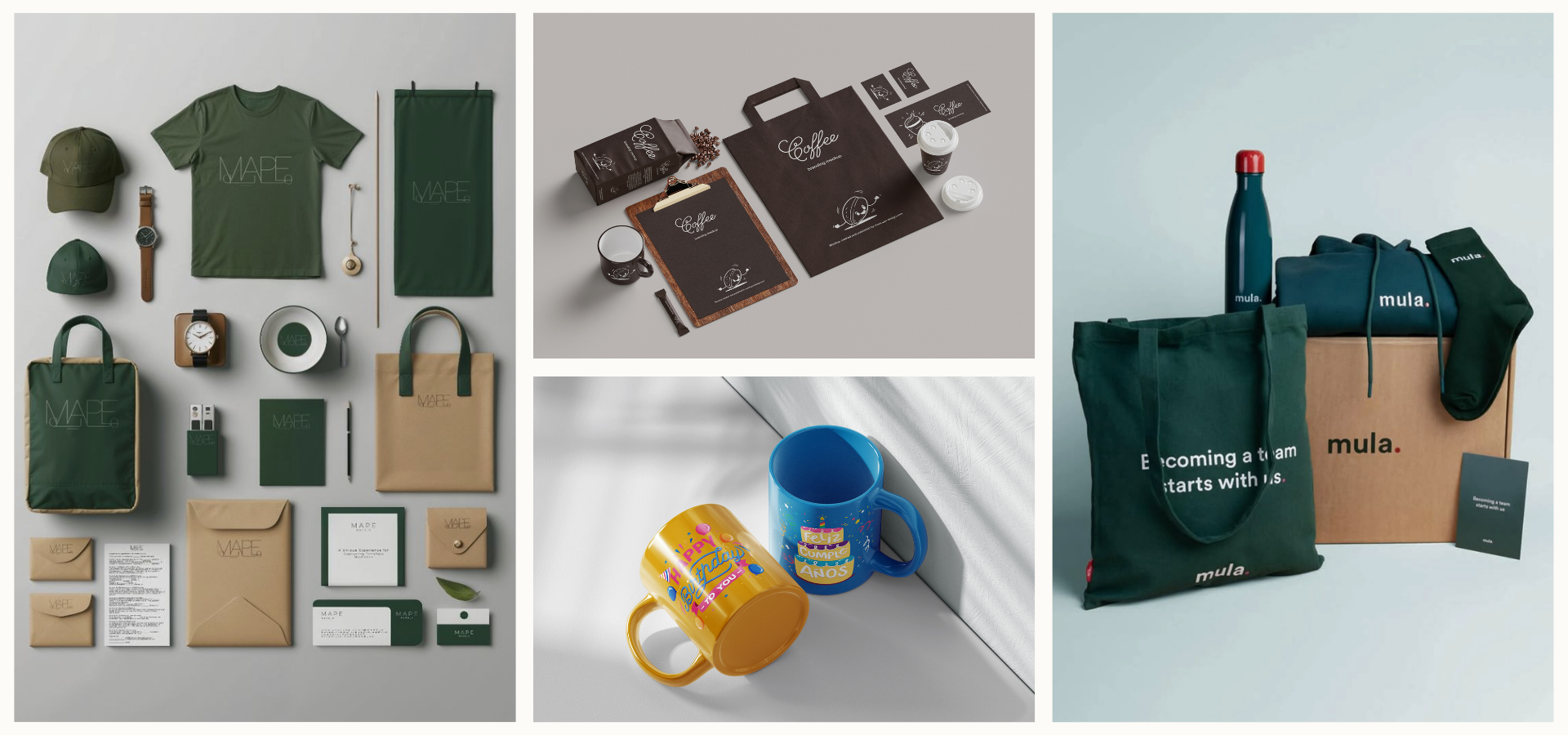 Kits de bienvenida, cortesías para clientes, regalos corporativos, empaques de regalo, productos personalizados (tazas, termos, gorras, entre otros).