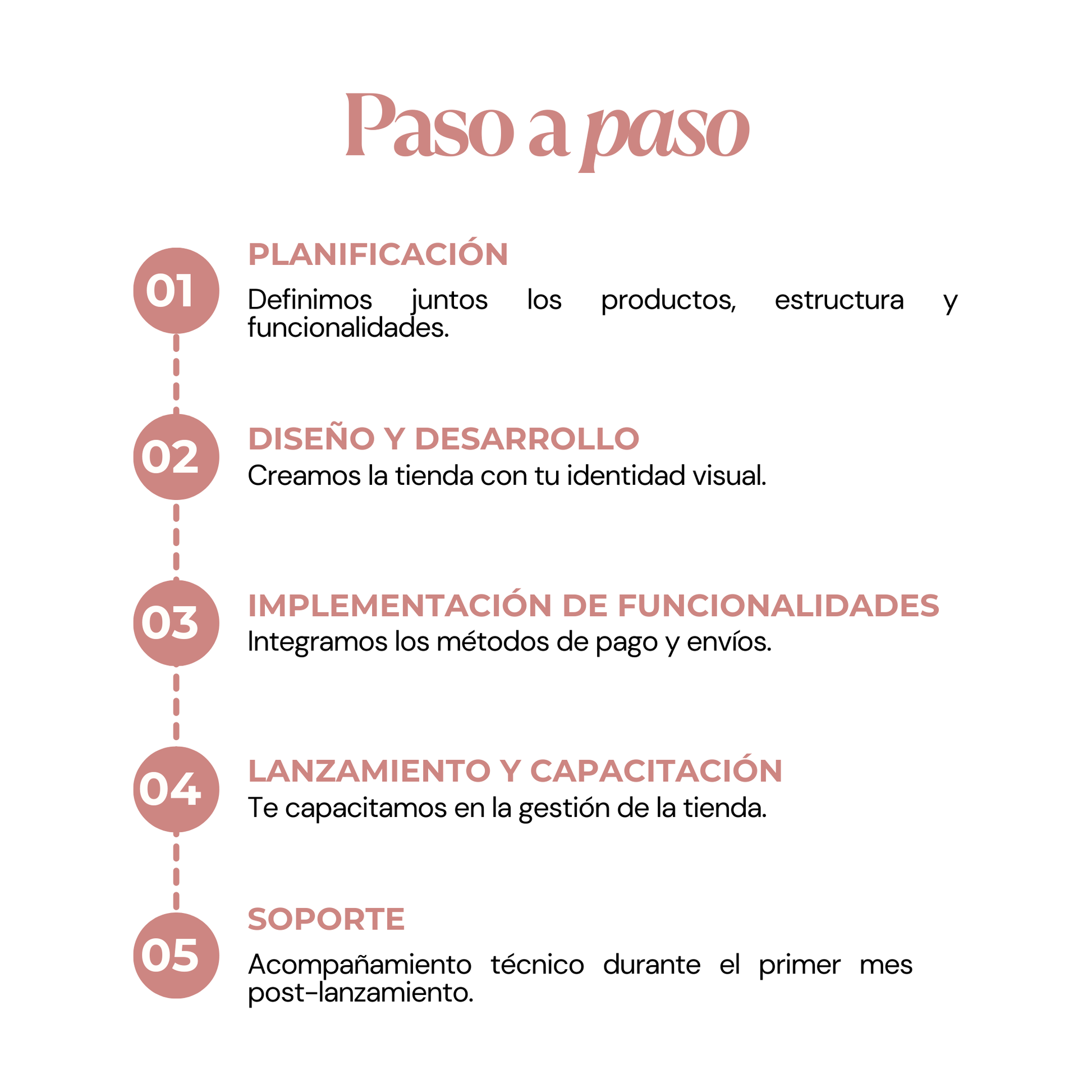 - Capacitación: Formación en gestión de la tienda, carga de productos, análisis de ventas, información para que puedas actualizar textos e imágenes de manera autónoma sin depender de soporte técnico constante.